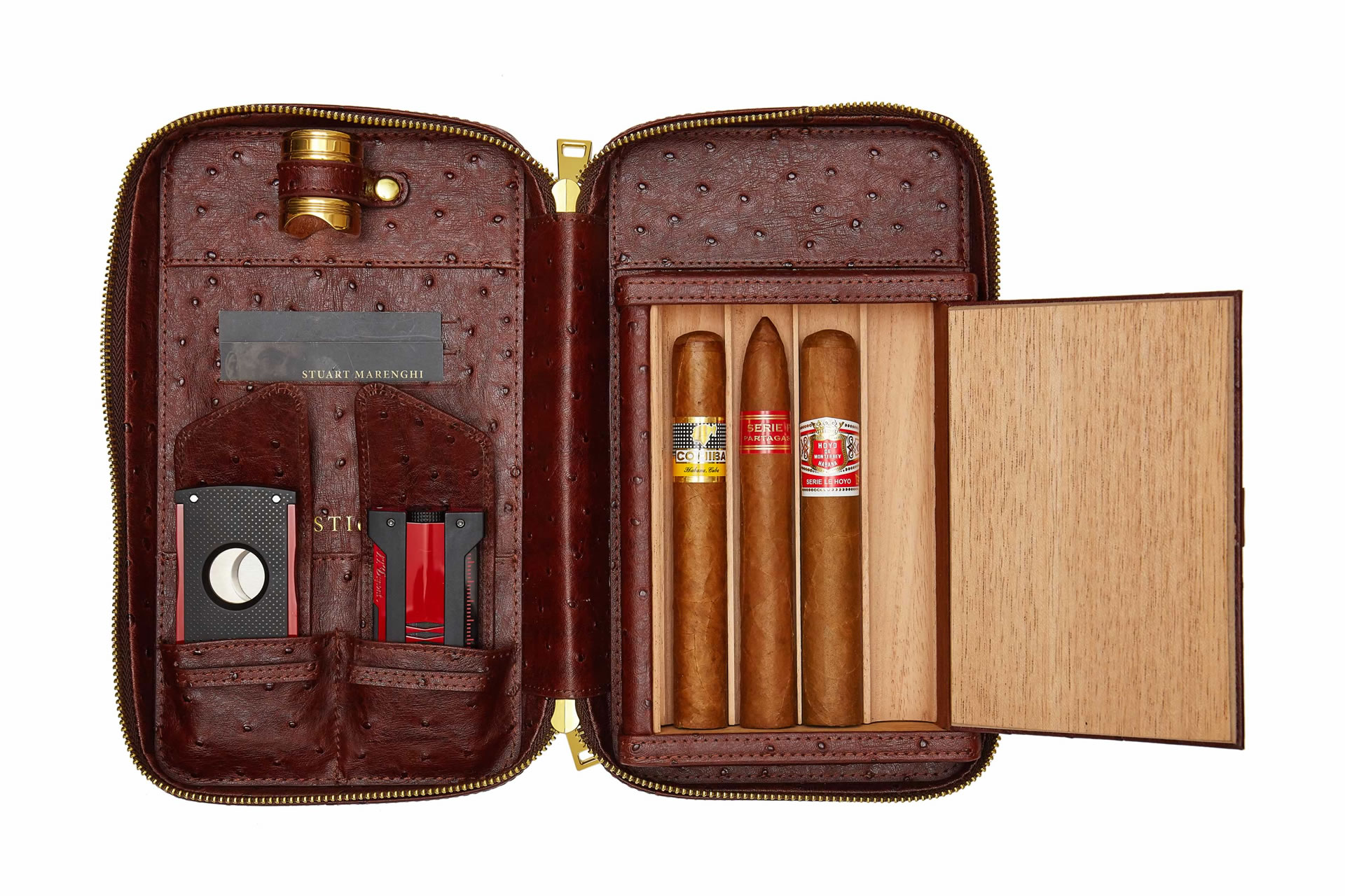 Our gift packages are designed to include everything a passionate cigar smoker would need on their travels. Quality lighters, cutters, rests and our own leather cigar travel cases are included, at a discount from the total price. If you’re looking for a gift for someone special, look no further.