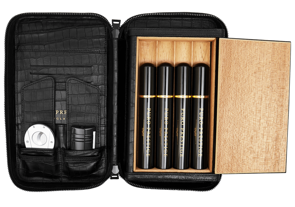 All of our travel cigar cases are built to last using only the finest materials. This version of our case is finished in crocodile skin-style black leather – giving a more robust, rugged feel when compared to our original classic case. It is the ideal travel companion – sure to catch the eye of any fellow cigar aficionados.