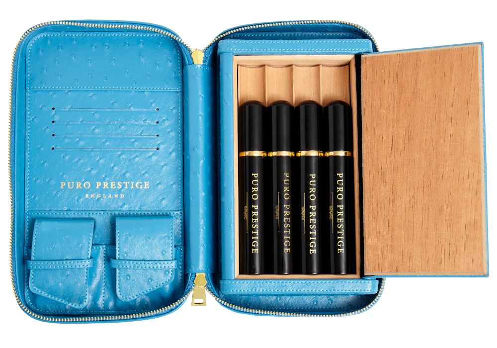 All of our travel cigar cases are built to last using only the finest materials. This version of our case is finished in ostrich skin-style blue leather – giving a more robust, rugged feel when compared to our original classic case. It is the ideal travel companion – sure to catch the eye of any fellow cigar aficionados.