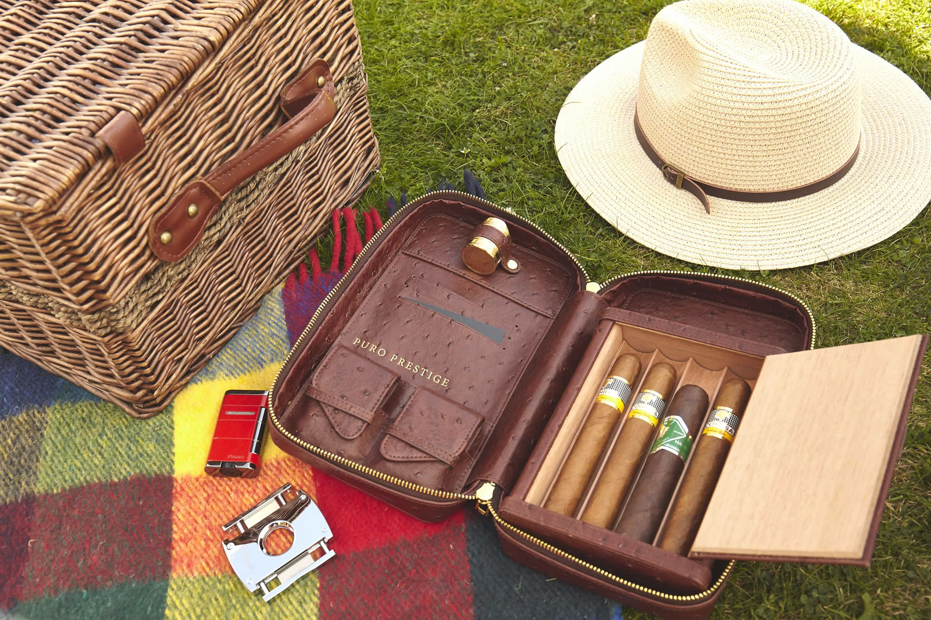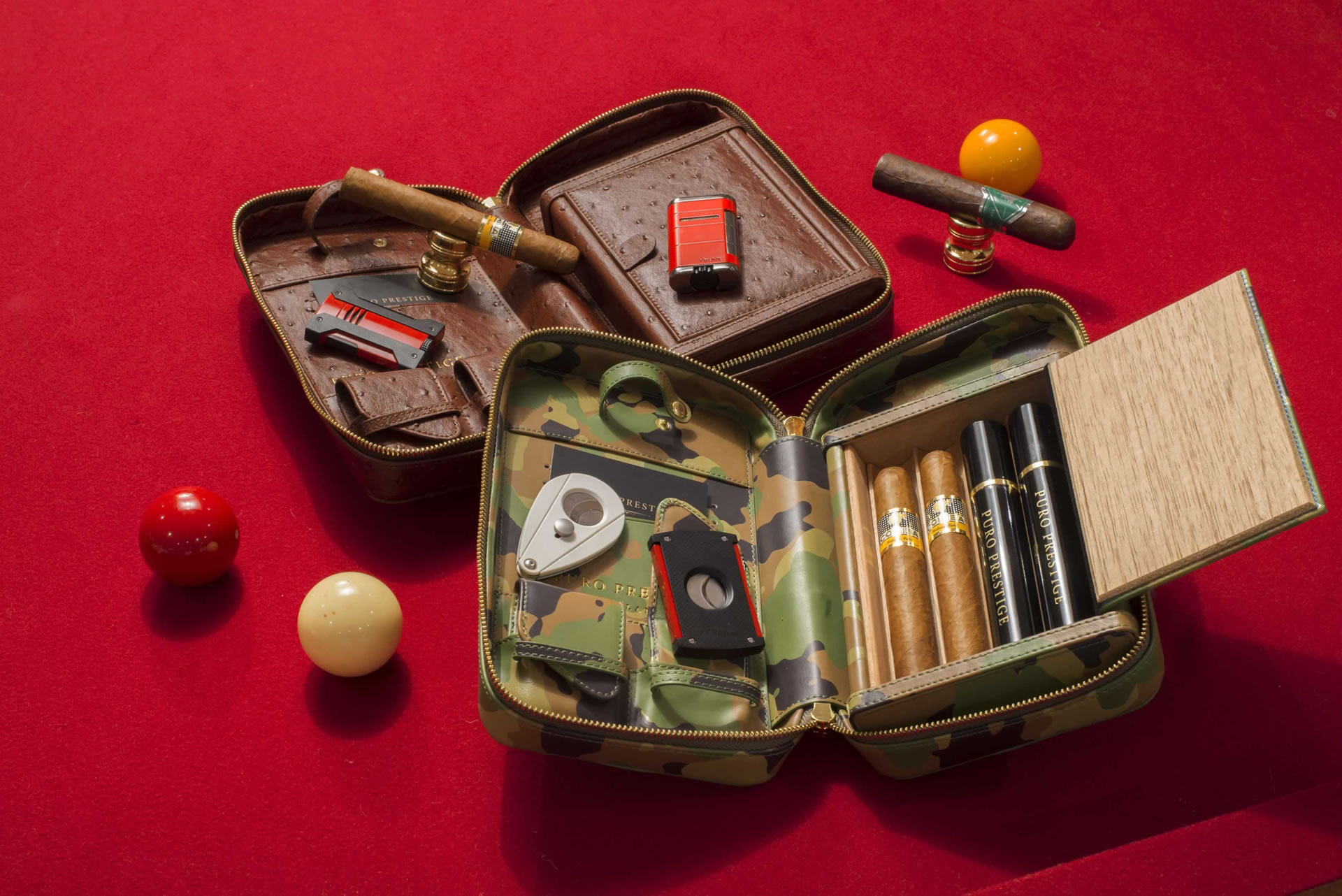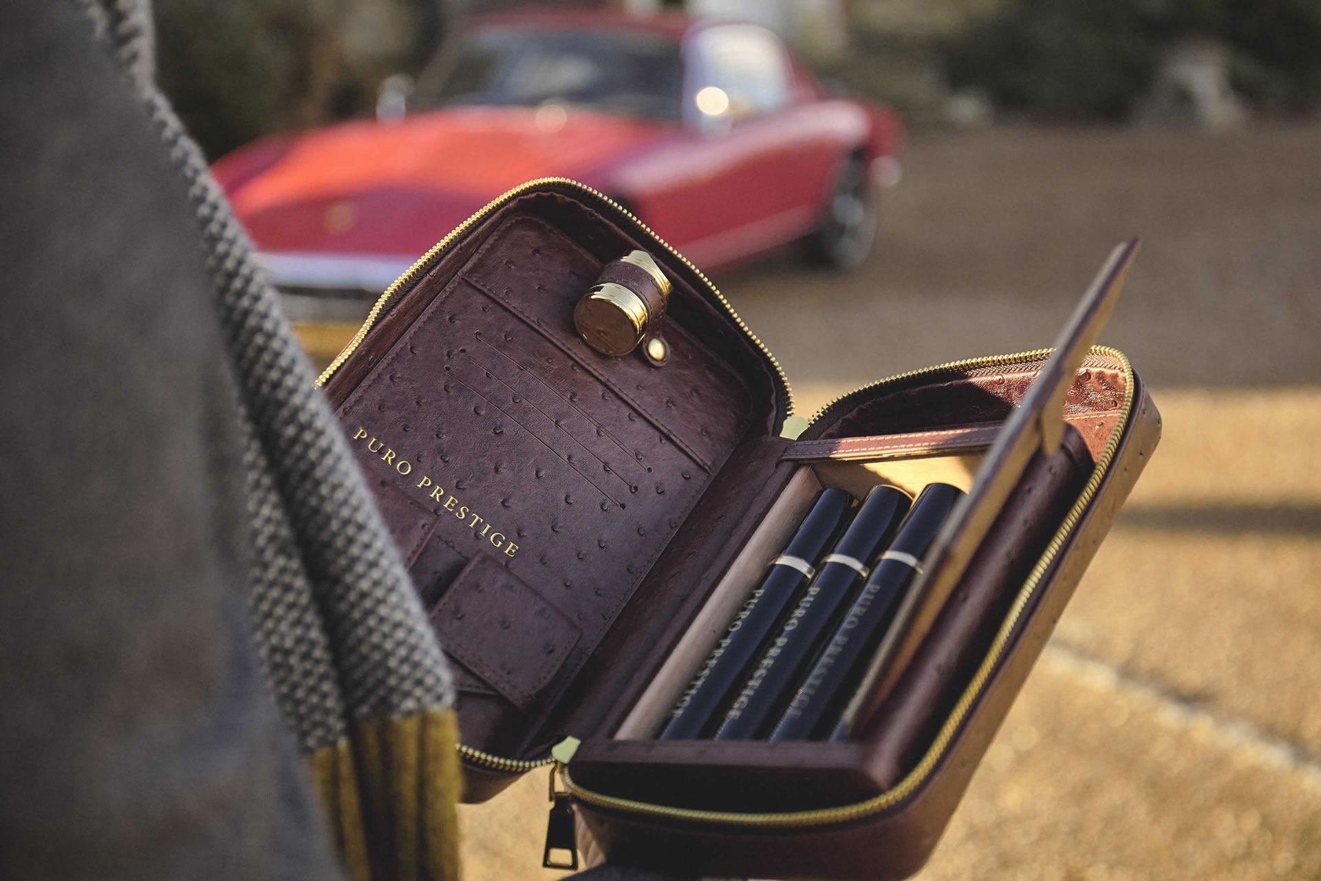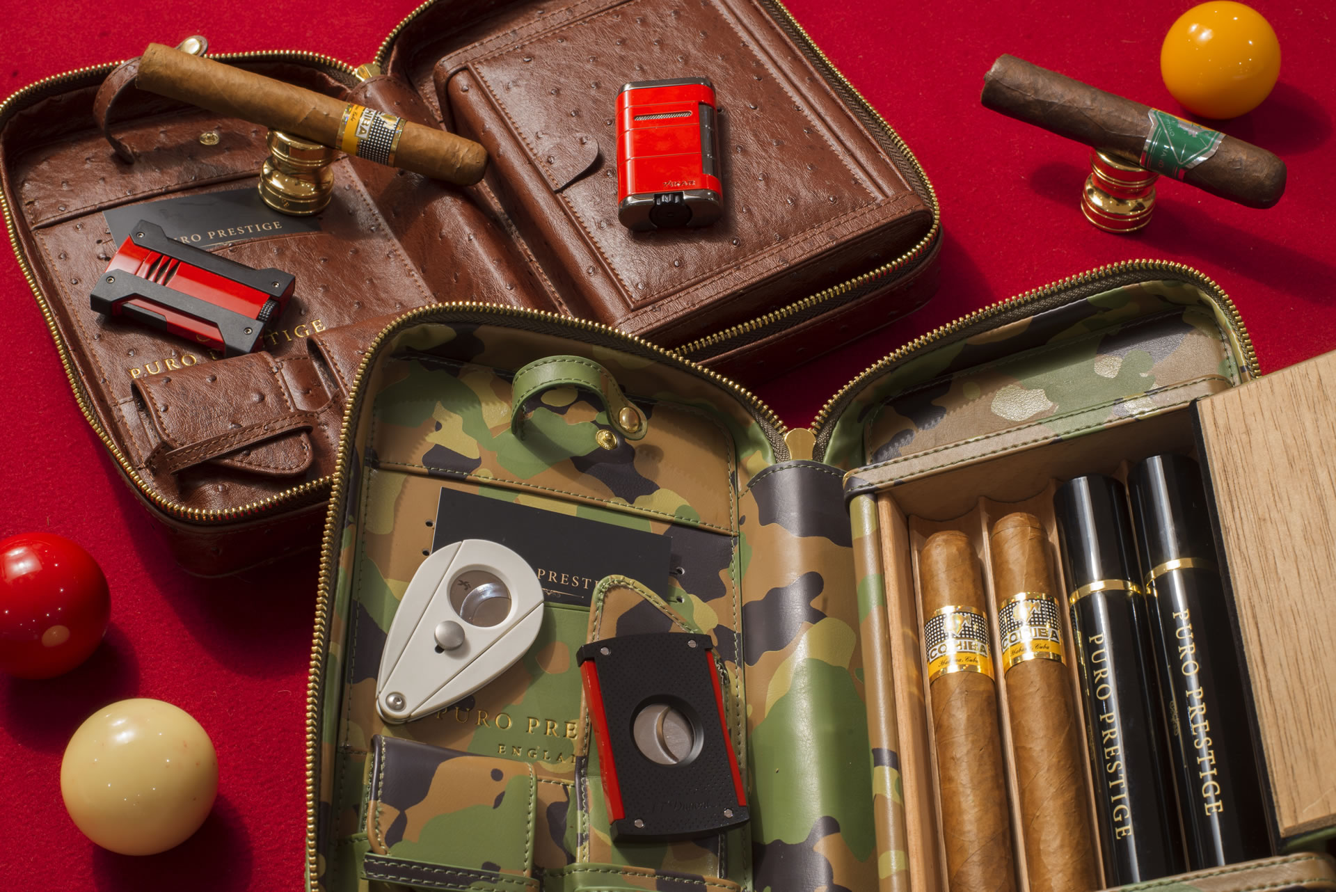 “Imagine my genuine delight at catching sight of a lovely new travelling humidor, designed with the cigar lover in mind. Puro Prestige have created this rather pleasing carry box (think luxury washbag for your favourite smokes!) in fetching Ostrich leather, or indeed camo, and it includes a cedar-lined compartment complete with aluminium tubes for four big smokes, a gold or silver cigar rest and pockets for cutter, lighter and a few business cards.”