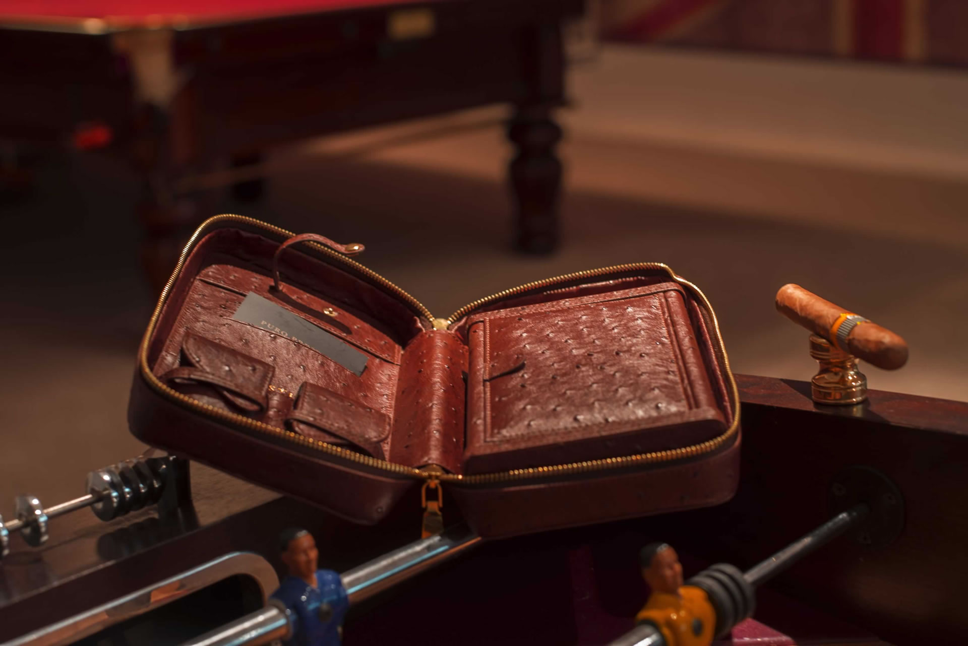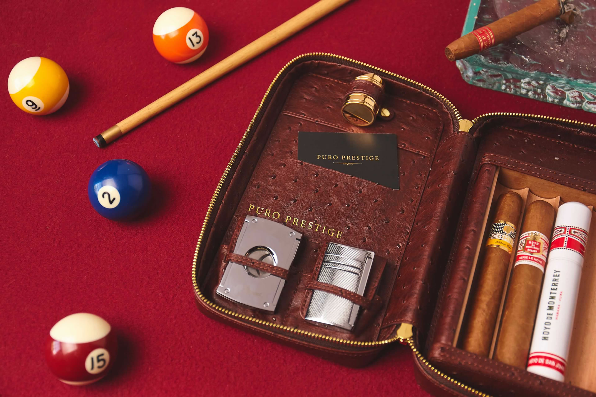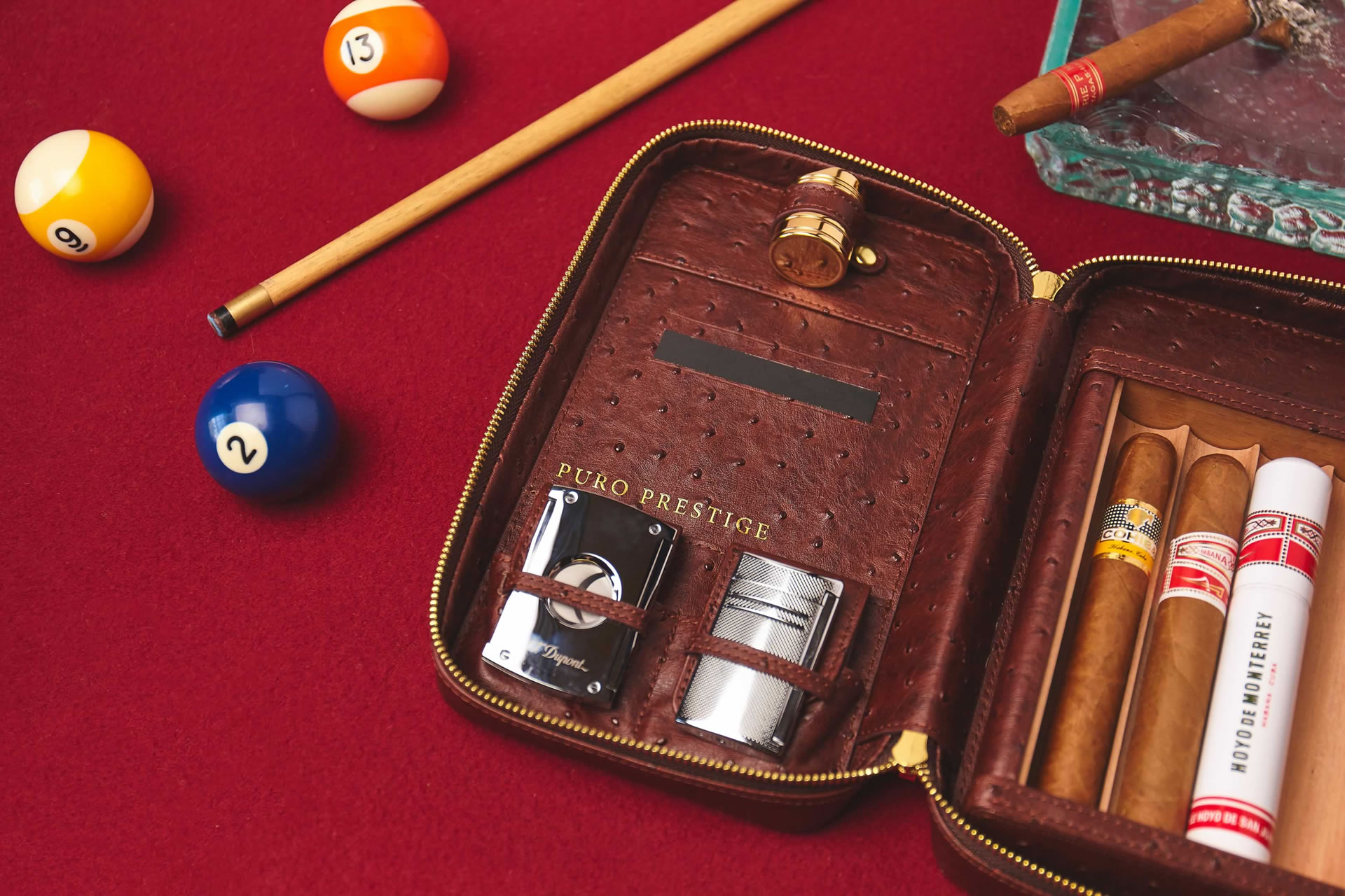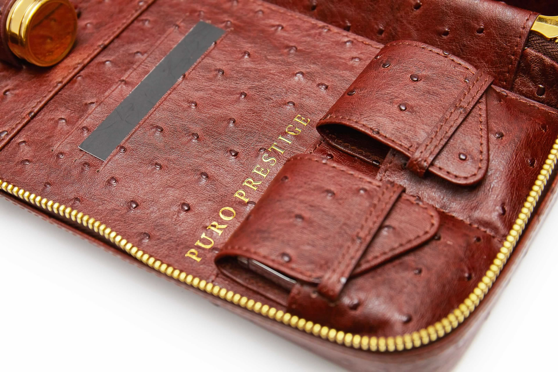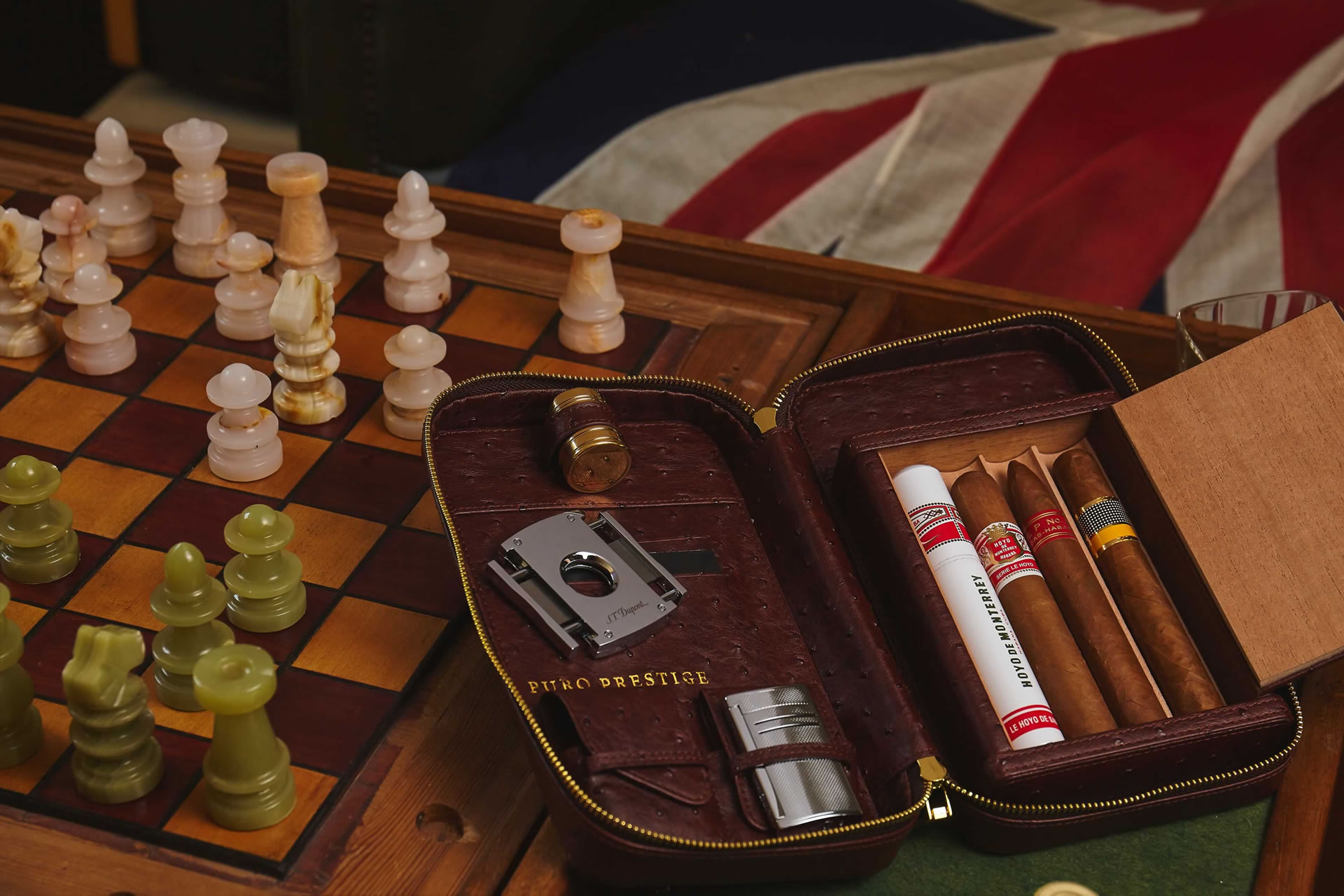 “Imagine my genuine delight at catching sight of a lovely new travelling humidor, designed with the cigar lover in mind. Puro Prestige have created this rather pleasing carry box (think luxury washbag for your favourite smokes!) in fetching Ostrich leather, or indeed camo, and it includes a cedar-lined compartment complete with aluminium tubes for four big smokes, a gold or silver cigar rest and pockets for cutter, lighter and a few business cards.”